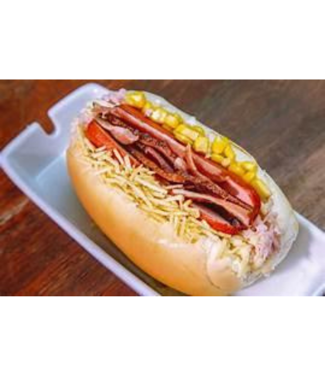 salsicha – bacon – milho – ervilha – tomate – alface – maionese – ketchup – batata palha