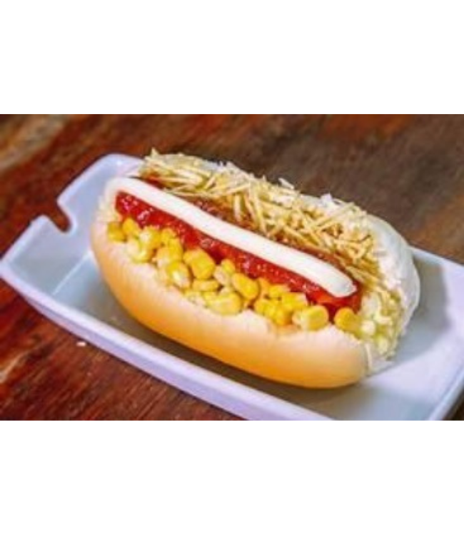 salsicha – muçarela – catupiry – palmito – milho – alface – maionese – ketchup – batata palha